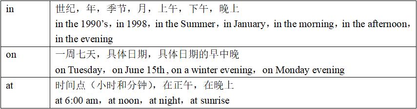 所以到底怎样使用这些介词呢?基本的规则是:描述的时间概念越大,我们就用in,特指具体的日子或者具体日子的早中晚则用on,表示具体的时刻则用at。